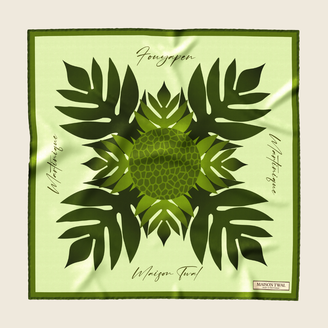 Fouyapen célèbre la beauté de l'Arbre à pain et ses feuilles emblématiques. Autour du cou, à la taille ou noué dans les cheveux, c'est le carré parfait à offrir ou à s'offrir.
